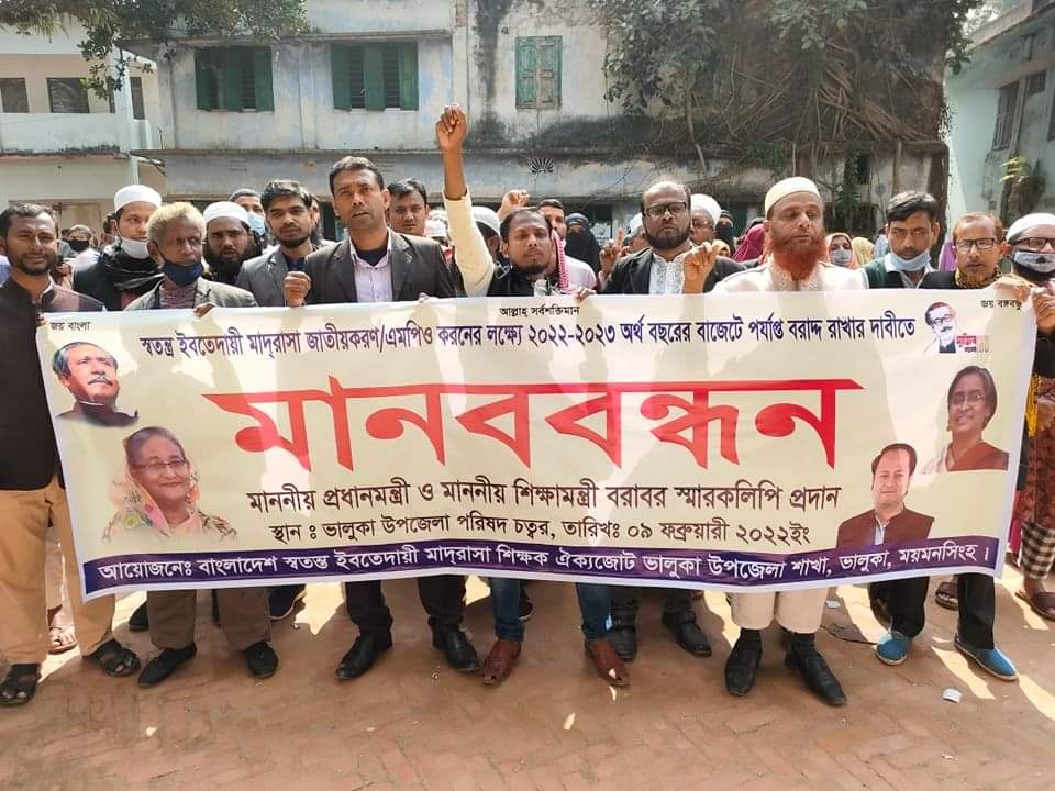 ভালুকায় স্বতন্ত্র ইবতেদায়ী মাদ্রাসা জাতীয়করণ সহ ৮ দফা দাবীতে মানববন্ধন