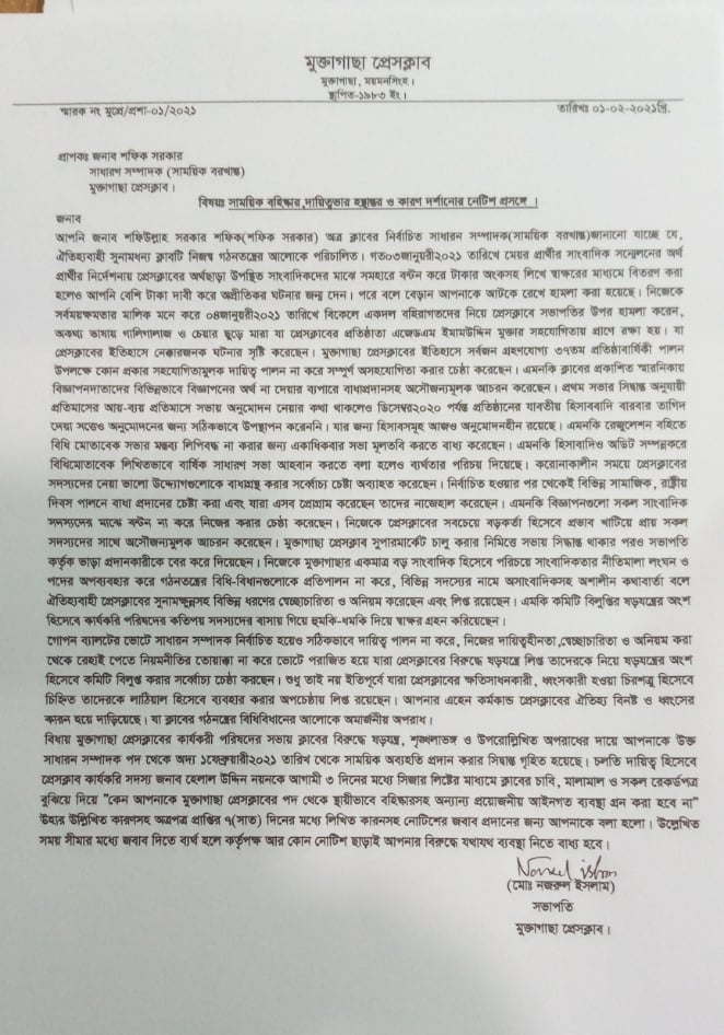 মুক্তাগাছা প্রেসক্লাবের সাধারন সম্পাদক শফিক সরকার বহিস্কার