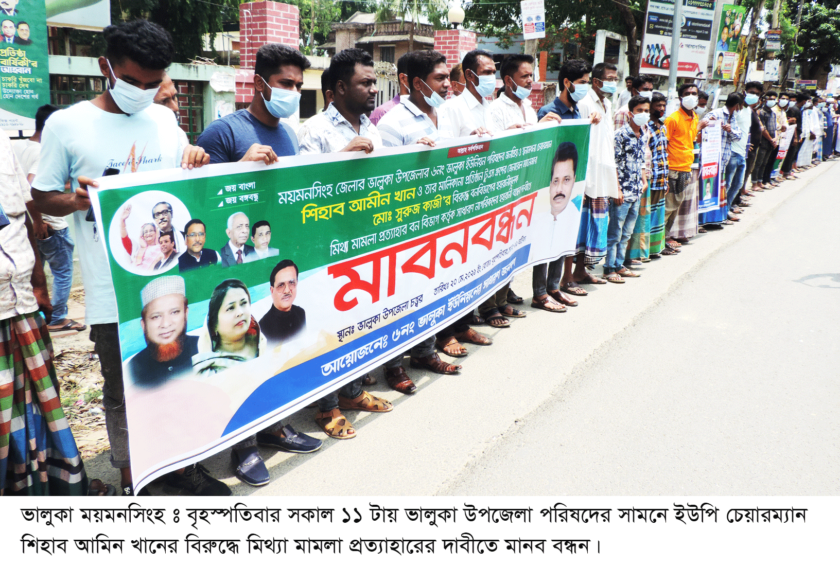 ভালুকায় ইউপি চেয়ারম্যানের বিরুদ্ধে মিথ্যা মামলা প্রত্যাহার ও হয়রানী বন্ধের দাবীতে মানববন্ধন