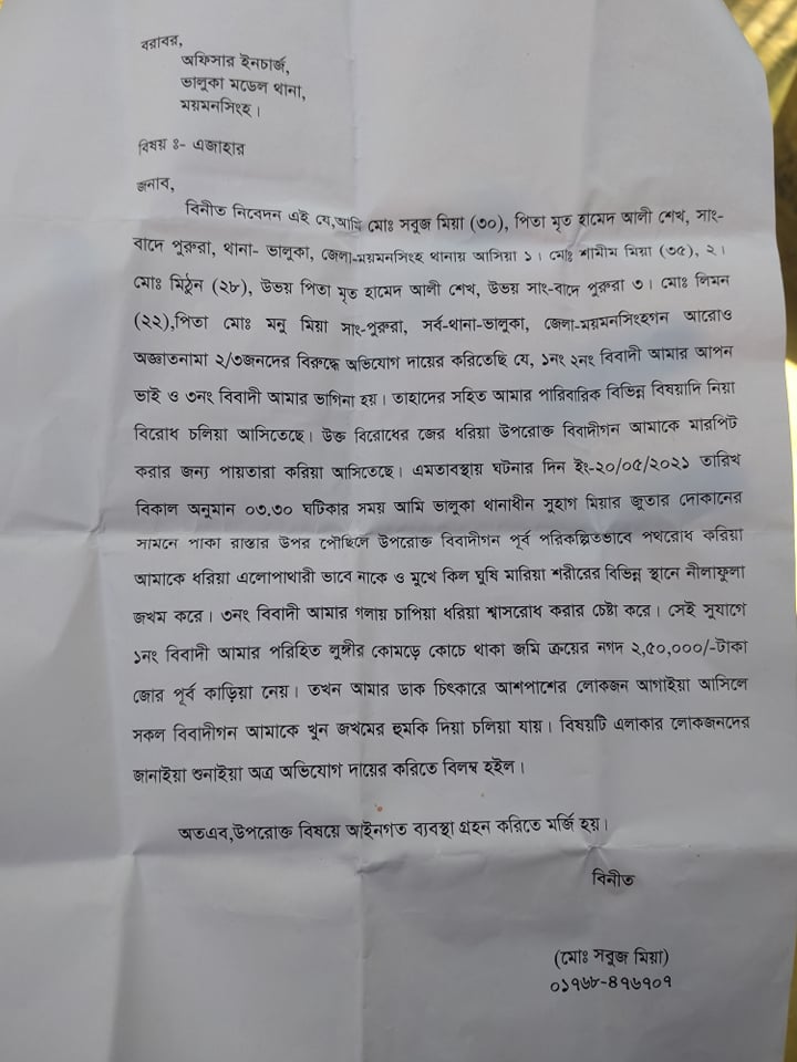 ভালুকায় বড় ভাইয়ের বিরুদ্ধে টাকা ছিনিয়ে নেওয়ার অভিযোগ