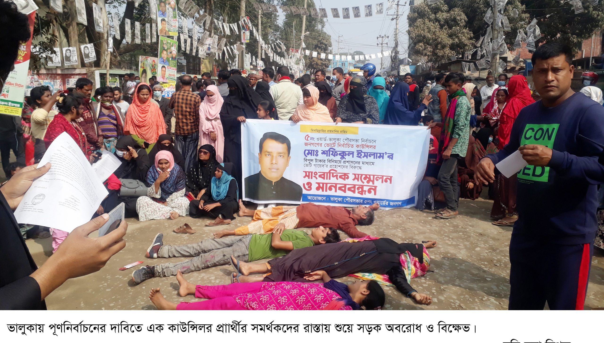 পুনরায় নির্বাচনের দাবিতে ভালুকায় কাউন্সিলর প্রার্থীর সমর্থকদের সড়ক অবরোধ,বিক্ষোভ